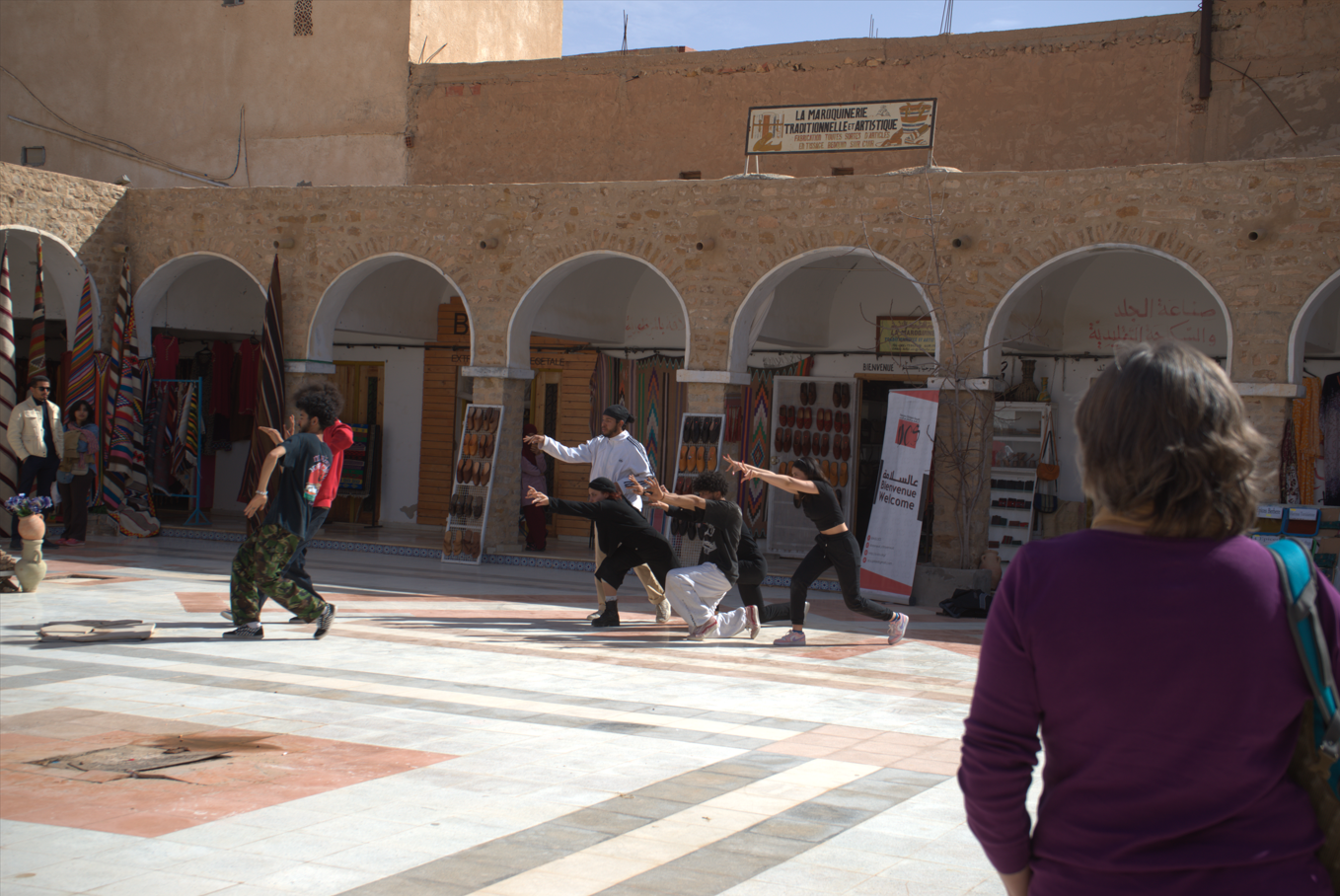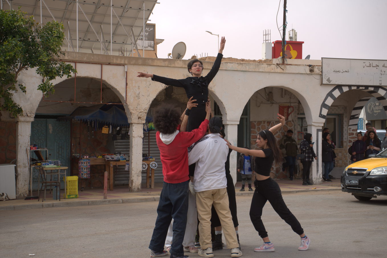 From February 25 to March 1, 2023, Danseurs Citoyens Sud presented a series of 15 artistic performances across five regions in southern Tunisia—Gabes, Medenine, Djerba, Sfax, and Tataouine. Developed during an intensive bootcamp at the No Name Artistic Studio Lab in Gabes, the performances blended dance, theater, and music to reflect on Tunisia’s social, political, and economic landscape. Each location—ranging from No Name Studio and Matmata to 2 March Square in Gabes—was selected for its unique cultural and historical significance. By addressing themes of inclusion, unity, and acceptance, the performances sparked diverse audience reactions that revealed both the tensions and transformative potential of street art in public spaces.